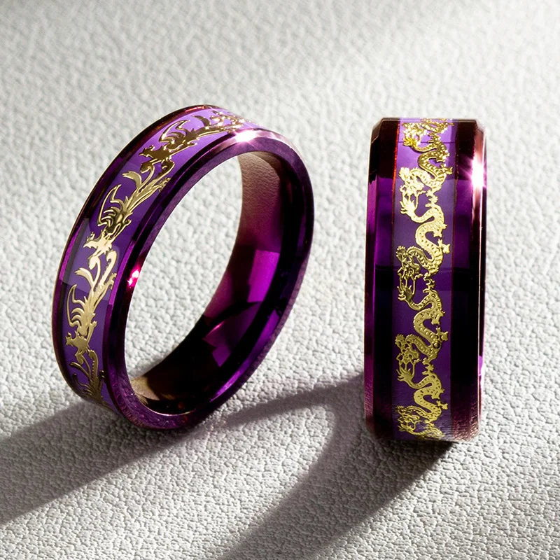 - Symbole du dragon & du phénix - Couleurs violettes & dorées royales - Acier poli & design harmonieux - Symbole d’amour éternel et puissant
