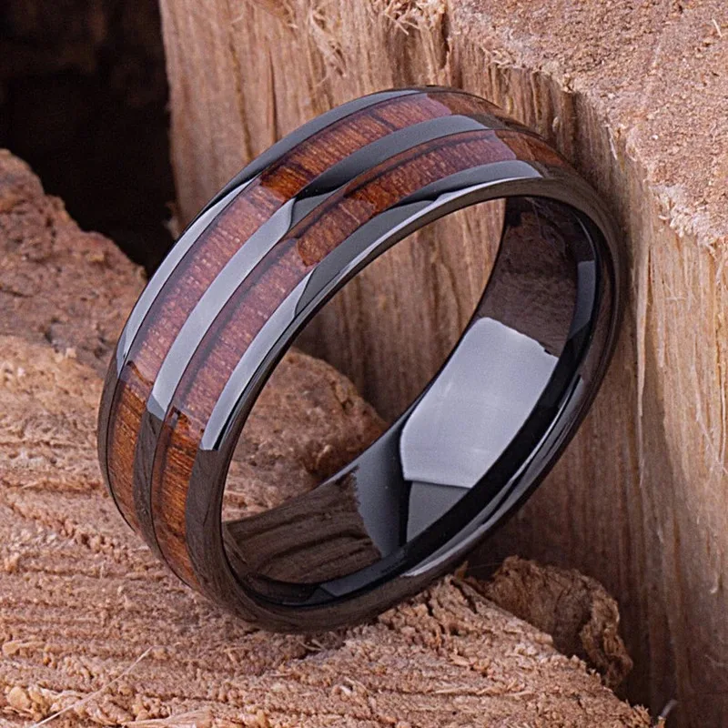Koa Lux – Bague homme titane noir incrustée bois Koa