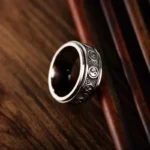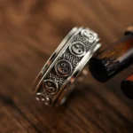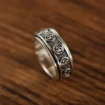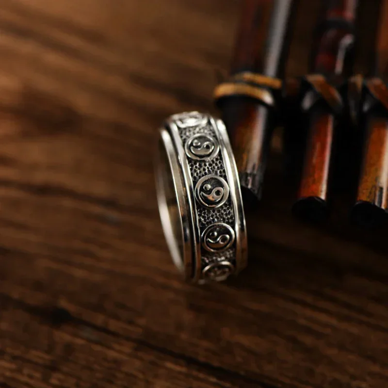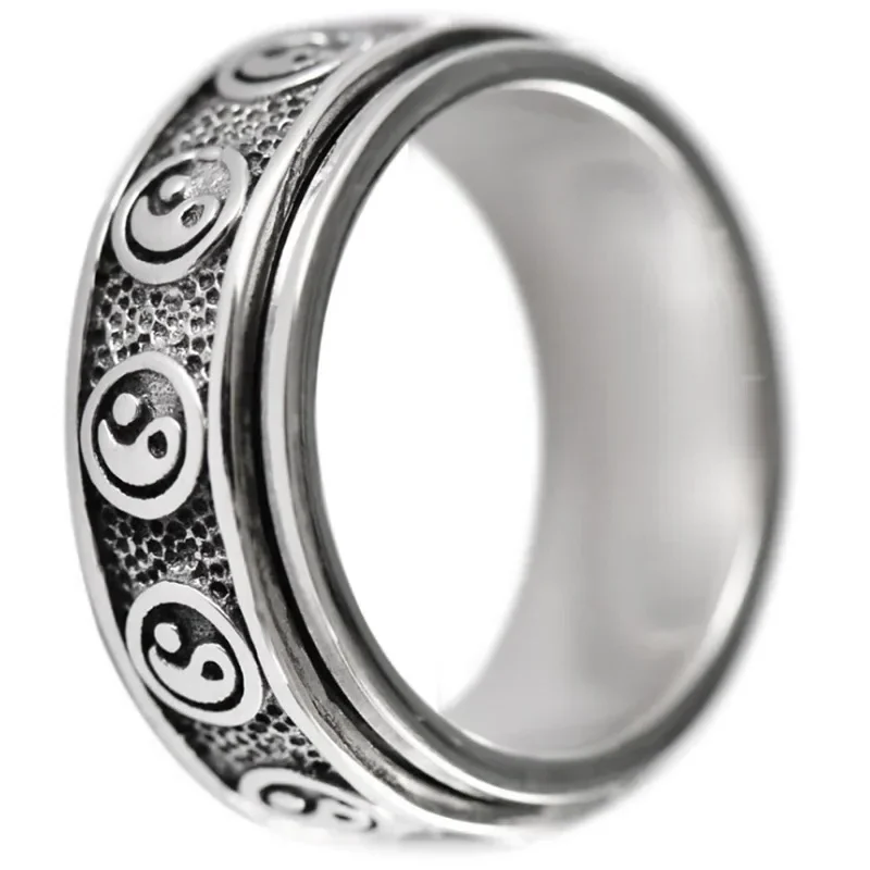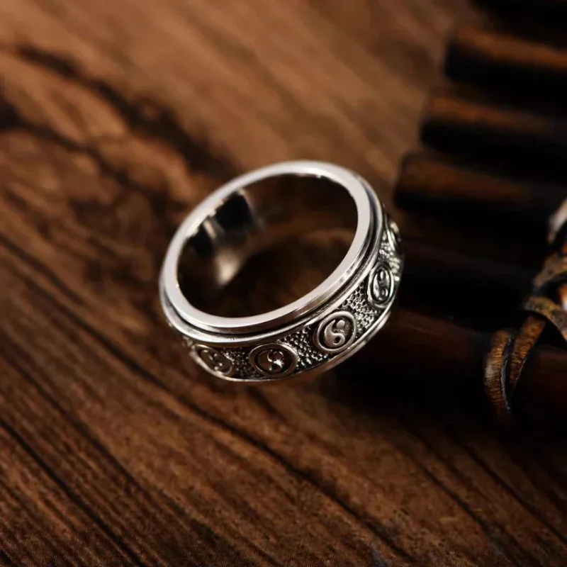 Confectionnée en argent 925 de qualité, elle se distingue par ses motifs en relief minutieusement travaillés représentant le symbole Yin Yang à intervalles réguliers. Cet anneau au design rotatif apporte une dimension pratique et apaisante : il peut être tourné du bout des doigts, offrant une fonction anti-stress subtile et élégante.