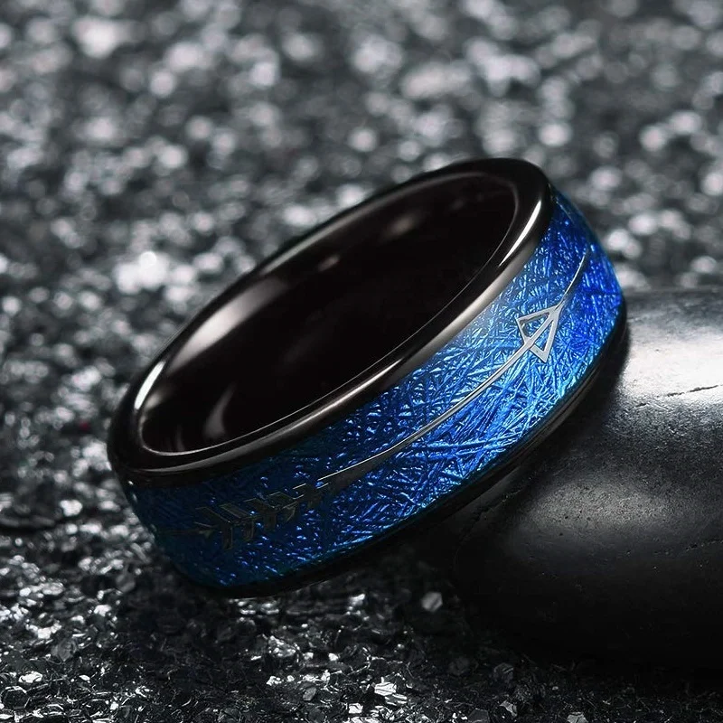 Astreus – Bague homme tungstène bleu flèche gravée 8mm